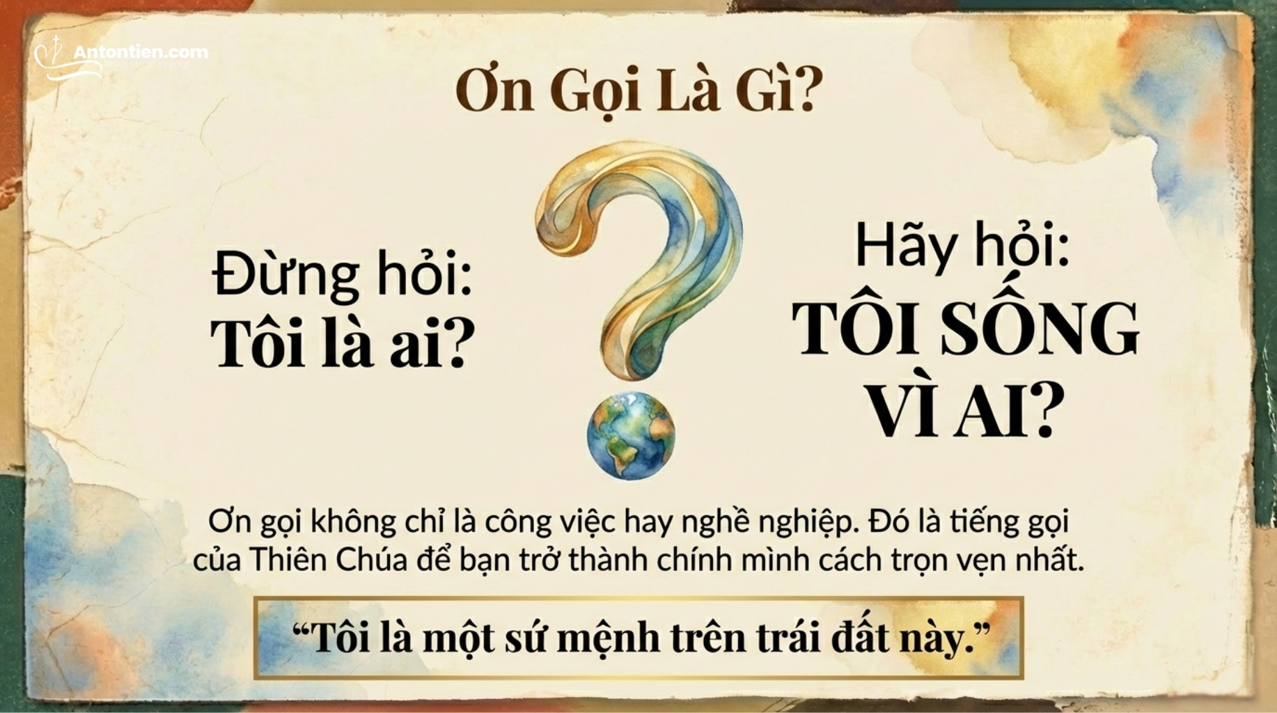 256. Điều đó đem lại giá trị rất lớn cho những công việc này, vì chúng không còn chỉ là tất cả những gì chúng ta làm để kiếm tiền, để khỏi ở không hay để làm vui lòng người khác. Tất cả những điều ấy làm thành ơn gọi bởi vì chúng ta được kêu gọi; có điều gì đó còn hơn cả sự chọn lựa thực dụng đơn giản của chúng ta. Cuối cùng, đó là việc nhận ra lý do vì sao tôi được dựng nên, vì sao tôi đang ở chỗ này, nhận ra đâu là kế hoạch Chúa dành cho đời tôi. Chúa sẽ không chỉ cho tôi thấy mọi nơi chốn, thời gian và chi tiết, tôi sẽ phải khôn ngoan chọn lựa. Nhưng Chúa sẽ chỉ cho tôi một hướng đi cho đời tôi, vì Chúa là Đấng dựng nên tôi, là thợ gốm nặn ra tôi, và tôi cần lắng nghe Chúa để Ngài nắn đúc và tác tạo. Như thế tôi sẽ trở thành điều mà tôi phải là và trung thành với sự thật của chính tôi.
