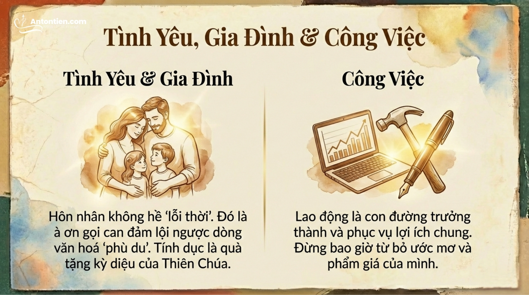 258. Trong đời sống của mỗi người trẻ, việc ta “sống vì người khác” thường gắn với hai vấn đề căn bản: tạo lập một gia đình mới và làm việc. Các bản thăm dò giới trẻ nhiều lần xác nhận rằng đây là hai vấn đề lớn làm cho họ vừa bận tâm vừa hứng thú. Hai vấn đề này phải được xem xét cách đặc biệt. Chúng ta hãy lược qua từng vấn đề.