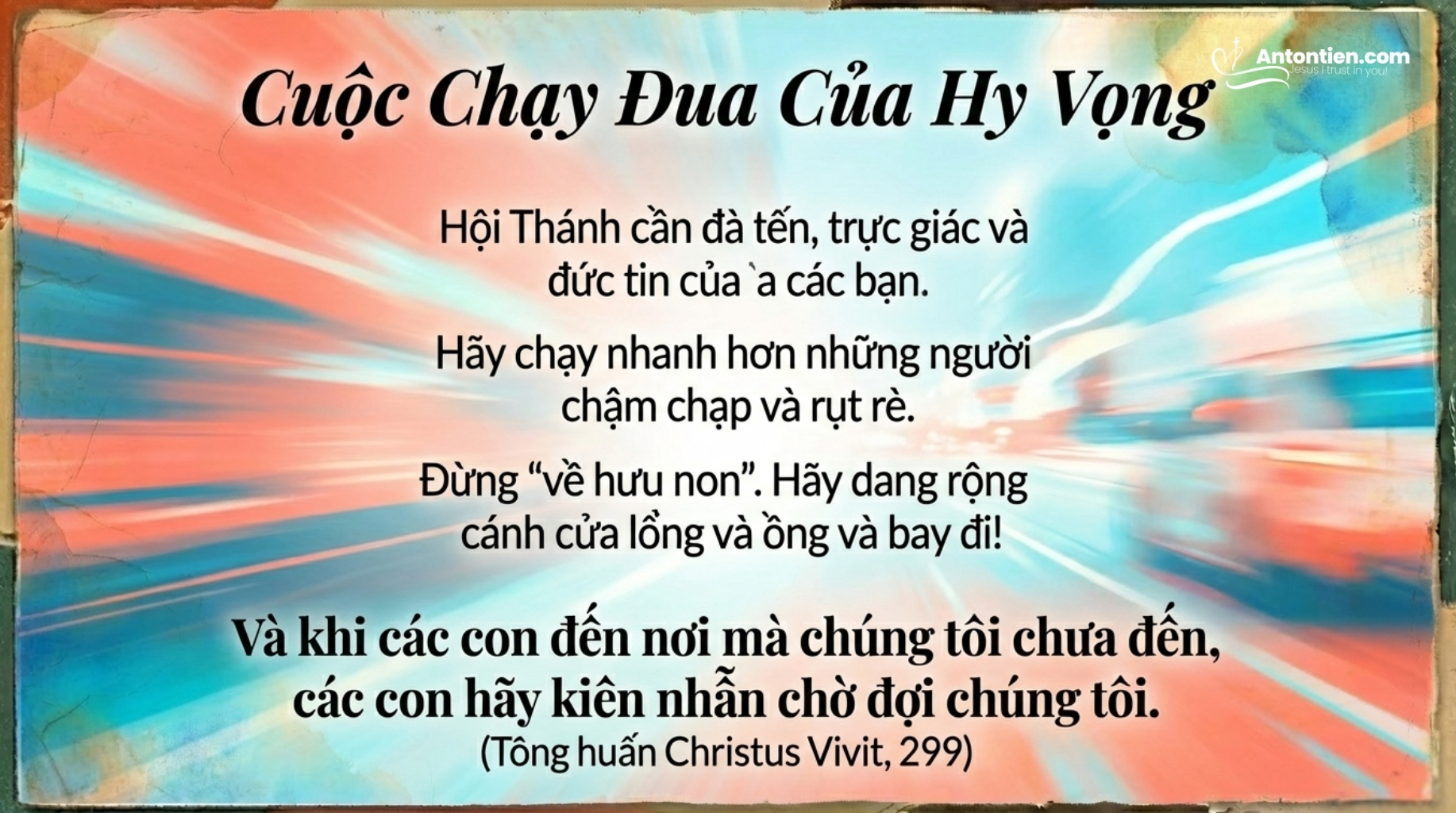 299. Các bạn trẻ thân mến, cha sẽ vui mừng khi thấy các con chạy nhanh hơn những người chậm chạp và rụt rè. Các con cứ chạy, vì “được Tôn nhan đáng yêu thu hút, Đấng mà chúng ta tôn thờ trong Thánh Thể và nhận ra Ngài nơi thân mình của người anh em đau khổ. Xin Chúa Thánh Thần thúc đẩy các con trong hành trình tiến về phía trước. Hội Thánh đang cần đà tiến của các con, cần những trực giác và đức tin của các con. Và khi các con đến nơi mà chúng tôi chưa đến, các con hãy kiên nhẫn chờ đợi chúng tôi” [164].