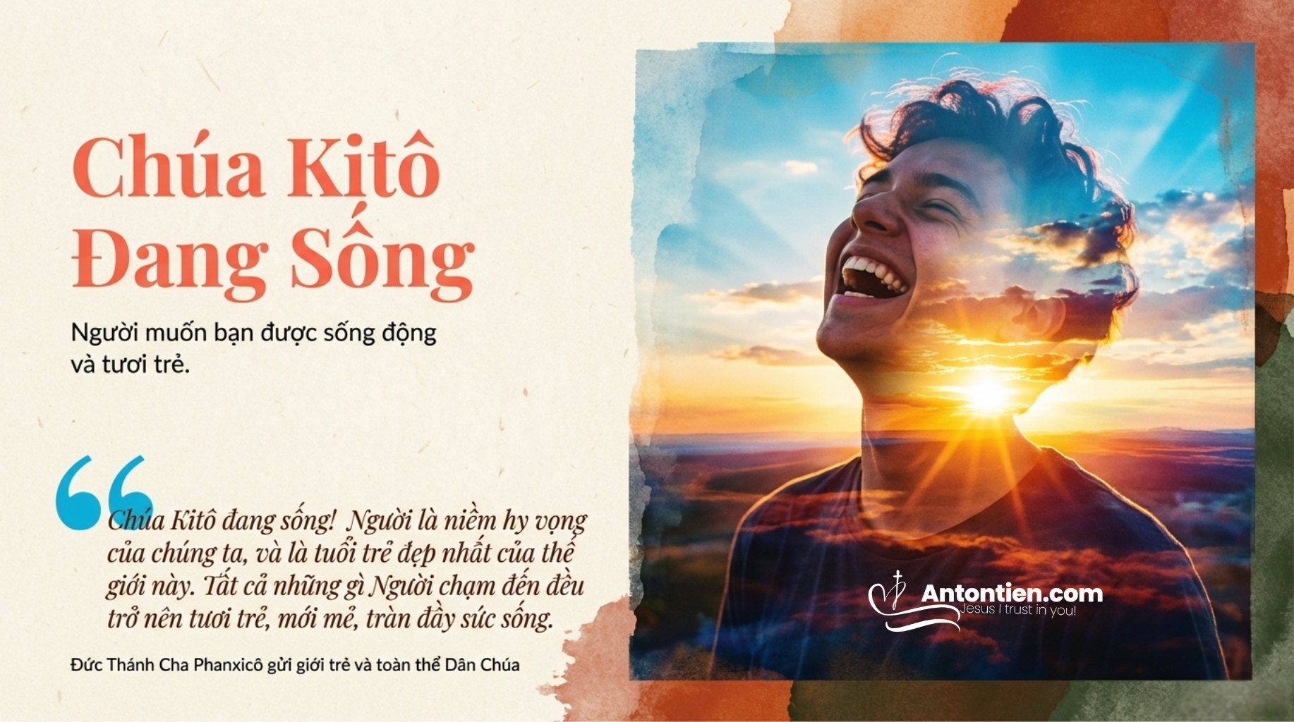 1. Chúa Kitô đang sống! Người là niềm hy vọng của chúng ta, và là tuổi trẻ đẹp nhất của thế giới này. Tất cả những gì Người chạm đến đều trở nên tươi trẻ, mới mẻ, tràn đầy sức sống. Thế nên, lời đầu tiên cha muốn nói với mỗi Kitô hữu trẻ là: Chúa Kitô đang sống và Người muốn con cũng được sống!