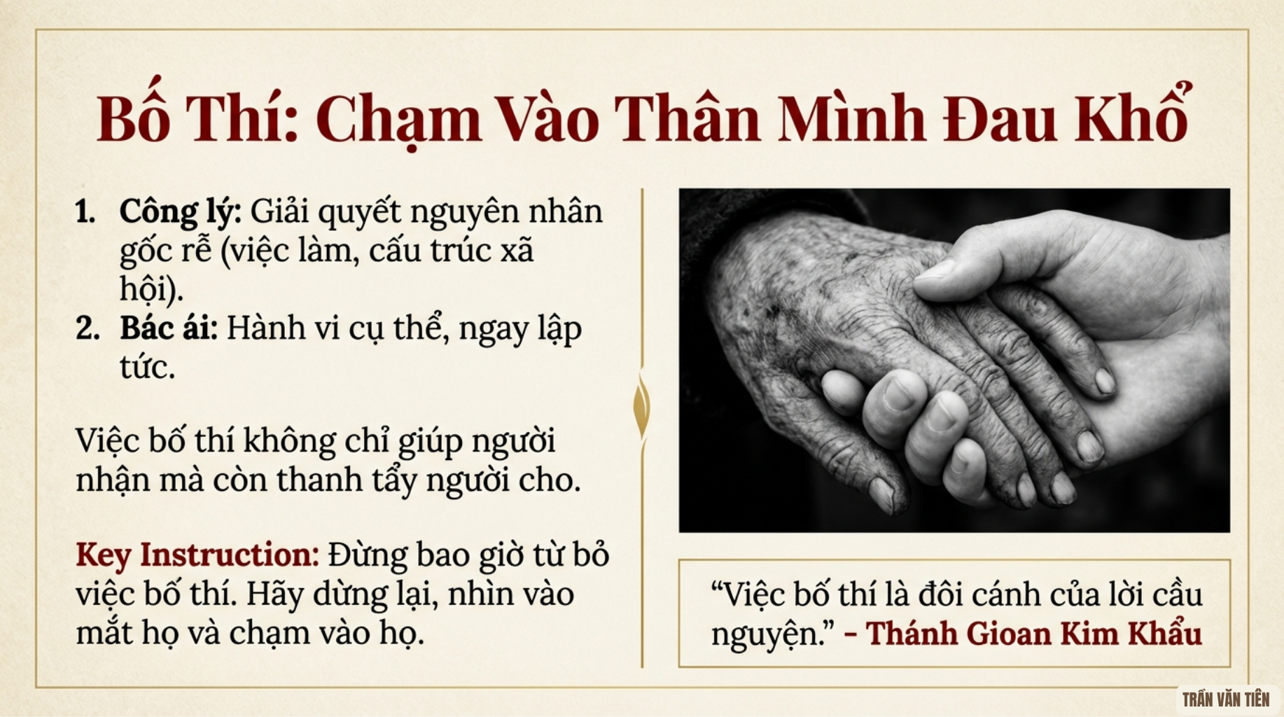 42. Do đó, bác ái không phải là điều tuỳ chọn, nhưng là một đòi hỏi của việc thờ phượng chân thật. Thánh Kim Khẩu mạnh mẽ lên án sự giàu có quá mức gắn liền với sự thờ ơ đối với người nghèo. Sự quan tâm dành cho họ không chỉ là một yêu cầu xã hội, mà còn là điều kiện để được ơn cứu độ, biến của cải bất chính thành một yếu tố kết án. “Trời giá lạnh, còn người nghèo thì nằm co ro trong giẻ rách, hấp hối, run rẩy, hình hài và y phục khiến ai cũng phải xúc động. Thế mà bạn, mặt đỏ bừng và say xỉn, lại thản nhiên bước qua. Vậy bạn còn mong Thiên Chúa cứu bạn khỏi tai hoạ sao?… Bạn thường tô điểm cho một xác chết vô tri, chẳng còn danh dự gì nữa, với những bộ trang phục thêu vàng lấp lánh đủ loại. Vậy mà bạn lại khinh thường người đang bị đau đớn kia, người ấy đang bị xé nát, bị hành hạ, bị dày vò bởi đói khát và giá lạnh.”[32] Ý thức công bình xã hội sâu xa ấy đưa thánh nhân đến tuyên bố rằng: “Không cho người nghèo được chia sẻ của cải của chúng ta là ăn cắp của họ và tước đoạt mạng sống của họ, của cải chúng ta sở hữu không phải của chúng ta, mà là của họ.”[33]