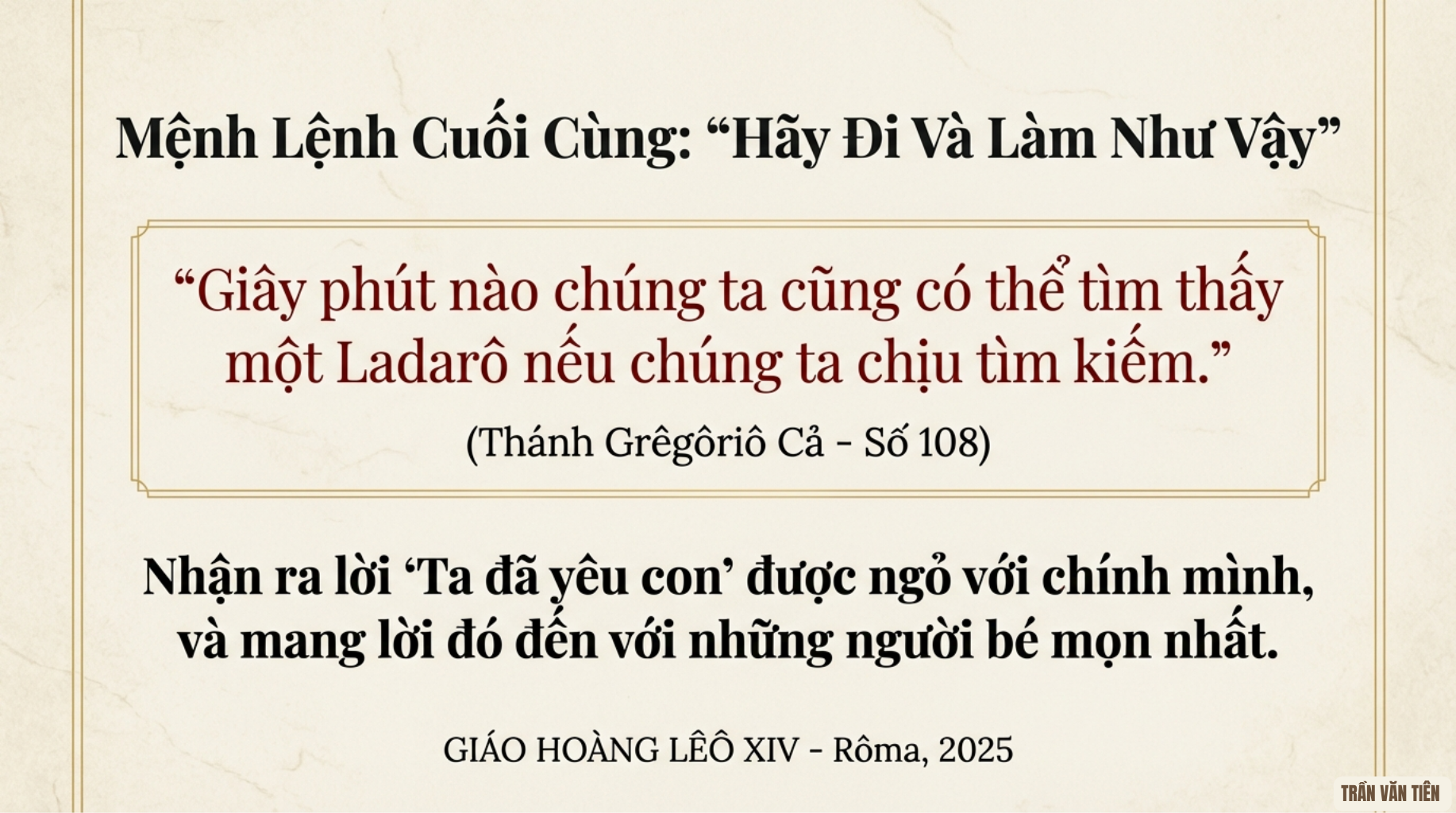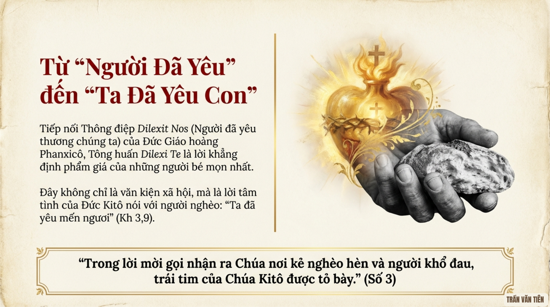 WHĐ (18/10/2025) – Tông huấn “Dilexi te” (Ta đã yêu con) là văn kiện đầu tiên của Đức Thánh Cha Lêô XIV, được công bố ngày 9/10/2025, tập trung vào tình yêu thương dành cho người nghèo. Sau đây là toàn văn Tông huấn bản dịch Việt ngữ do Thầy Giuse Phan Văn Phi, O.Cist. thực hiện.