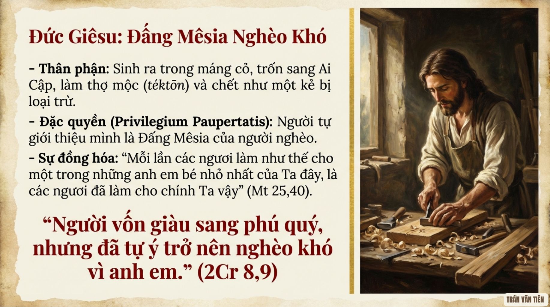20. Có vài chi tiết cho thấy thân phận xã hội của Đức Giêsu. Trước hết, Người làm thợ mộc, téktōn (x. Mc 6,3). Đây là những người kiếm sống bằng nghề lao động chân tay. Không có đất đai, họ bị coi là thấp kém hơn nông dân. Khi được thánh Giuse và Mẹ Maria dâng Hài nhi Giêsu vào Đền thờ, cha mẹ Người đã dâng một cặp chim gáy hoặc bồ câu non (x. Lc 2,22-24), mà theo quy định của sách Lêvi (x. Lv 12,8) thì đây là lễ vật của người nghèo. Một đoạn Tin Mừng khá quan trọng kể cho chúng ta nghe Đức Giêsu cùng các môn đệ bứt bông lúa mà ăn khi đi ngang qua cánh đồng lúa (x. Mc 2,23-28). Chỉ những người nghèo mới được phép mót lúa trên đồng. Hơn nữa, Đức Giêsu nói về chính mình: “Con chồn có hang, chim trời có tổ, nhưng Con Người không có chỗ tựa đầu” (Mt 8,20; Lc 9,58). Quả thật, Người là một vị thầy lưu động, sự nghèo khó và bấp bênh của Người là dấu chỉ mối dây liên kết với Chúa Cha, và cũng là điều đòi hỏi nơi những ai muốn theo Người trên con đường làm môn đệ. Như thế, từ bỏ của cải, tiền bạc, những bảo đảm trần thế, trở thành dấu chỉ hữu hình của sự phó thác vào Thiên Chúa và sự quan phòng của Người.