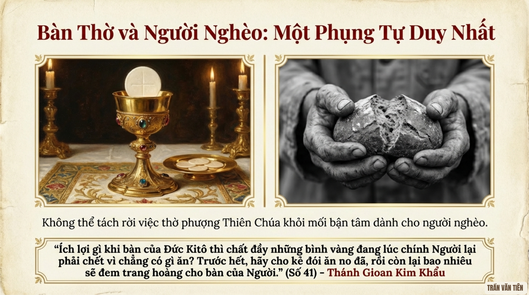 41. Trong hàng ngũ các Giáo phụ Đông phương, có lẽ nhà giảng thuyết nhiệt thành nhất về công bằng xã hội là thánh Gioan Kim Khẩu, Tổng Giám mục Constantinopolis vào cuối thế kỷ thứ IV sang đầu thế kỷ thứ V. Trong các bài giảng của mình, ngài đã khuyến dụ các tín hữu nhận ra Chúa Kitô nơi những người thiếu thốn: “Bạn muốn tôn kính thân thể Đức Kitô ư? Chớ khinh chê thân thể ấy khi thân thể ấy trần trụi: đừng có thái độ này là trong nhà thờ thì tôn kính, cho thân thể Người mang những y phục lụa là gấm vóc, nhưng ở ngoài lại coi thường, để cho thân thể ấy phải lạnh giá và trần trụi. Bởi vì Đấng nói Đây là mình Thầy và đã dùng lời của mình mà thực hiện việc đó, thì cũng chính là Đấng nói: Các ngươi đã thấy Ta đói mà không cho ăn và Các ngươi không làm như thế cho một trong những người bé nhỏ nhất đây, là các ngươi đã không làm cho chính Ta vậy. Thân thể Chúa ở đây không cần y phục, nhưng cần tâm hồn trong trắng, còn thân thể Chúa ngoài kia thì cần được chăm lo tận tình. Chúng ta hãy học cho biết suy nghĩ chín chắn sâu xa mà tôn kính Đức Kitô như Người muốn. Thật vậy, Đấng chúng ta tôn kính sẽ rất hài lòng khi chúng ta tôn kính theo cách Người chọn chứ không phải theo cách chúng ta nghĩ. Ông Phêrô tưởng là ông tôn kính Chúa khi ngăn cản không để Chúa rửa chân cho ông; nhưng muốn như thế chẳng phải là tôn kính, mà lại là điều trái ngược hẳn. Bạn cũng thế, hãy bày tỏ lòng tôn kính Người theo cách mà Người đã truyền dạy khi ra luật cho bạn: đem của cải phân phát cho người nghèo. Thiên Chúa chẳng cần bình vàng chén bạc, nhưng cần những tấm lòng vàng.”[30] Và với lời lẽ minh bạch, ngài khẳng quyết rằng nếu tín hữu không gặp Đức Kitô nơi người nghèo đang đứng ngoài cửa, thì họ cũng không thể thờ phượng Người ngay cả tại bàn thờ. Ngài tiếp: “Quả vậy, ích lợi gì khi bàn của Đức Kitô thì chất đầy những bình vàng đang lúc chính Người lại phải chết vì chẳng có gì ăn? Trước hết, hãy cho kẻ đói ăn no đã, rồi còn lại bao nhiêu sẽ đem trang hoàng cho bàn của Người.”[31] Vì thế, ngài hiểu Bí tích Thánh Thể như một diễn tả có tính bí tích của bác ái và công bình, vốn đi trước và gắn liền với nó. Chính bác ái và công bình ấy sẽ nối dài Bí tích Thánh Thể, xuyên qua tình yêu thương và sự quan tâm đến người nghèo.