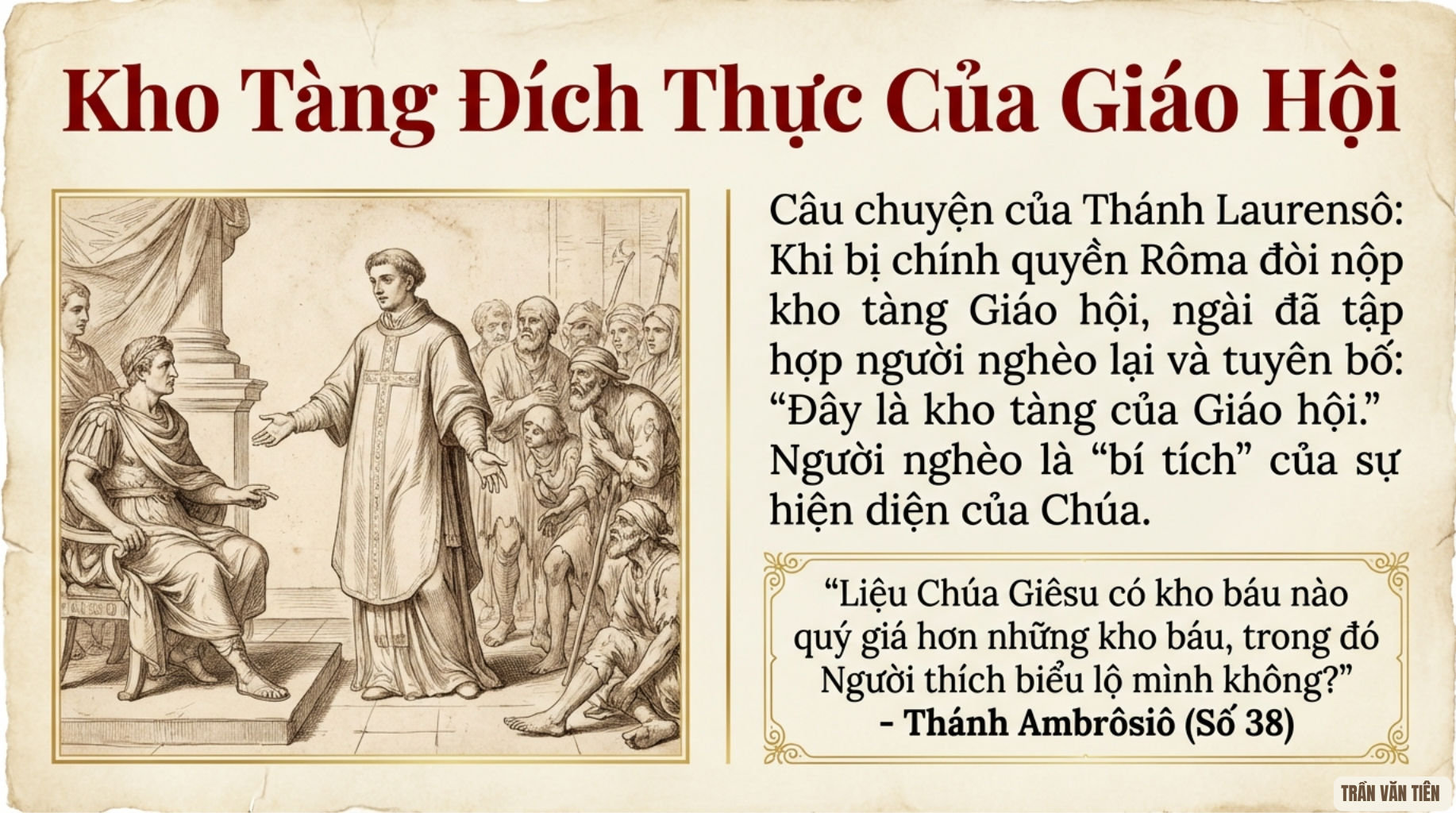 38. Chưa đầy hai thế kỷ sau, một phó tế khác là thánh Laurensô sẽ bày tỏ lòng trung thành với Đức Giêsu Kitô theo cách tương tự, kết hiệp chứng tá tử đạo với việc phục vụ người nghèo.[23] Theo lời kể của thánh Ambrôsiô, Laurensô là phó tế tại Rôma, vào thời Đức Giáo hoàng Sixtô II, đã bị nhà cầm quyền Rôma buộc phải nộp các kho tàng của Giáo hội. “Ngày hôm sau, ngài dẫn theo những người nghèo. Khi bị hỏi kho tàng đã hứa ở đâu, ngài chỉ vào người nghèo và nói, ‘Đây là kho tàng của Giáo hội.’”[24] Khi thuật lại biến cố này, thánh Ambrôsiô đã đặt câu hỏi: “Liệu Chúa Giêsu có kho báu nào quý giá hơn những kho báu, trong đó Người thích biểu lộ mình không?”[25] Và ghi nhớ rằng các thừa tác viên của Giáo hội không bao giờ được lơ là việc chăm sóc người nghèo, càng không được tích trữ của cải cho lợi ích riêng, ngài nói: “Nhiệm vụ này phải được thực hiện với đức tin chân thành và sự tiên liệu khôn ngoan. Chắc chắn, nếu ai đó rút lợi ích cá nhân từ việc này, người đó phạm tội; nhưng nếu người đó phân phát số tiền thu được cho người nghèo hoặc chuộc một tù nhân, người đó thực hiện một công việc thương xót.”[26]