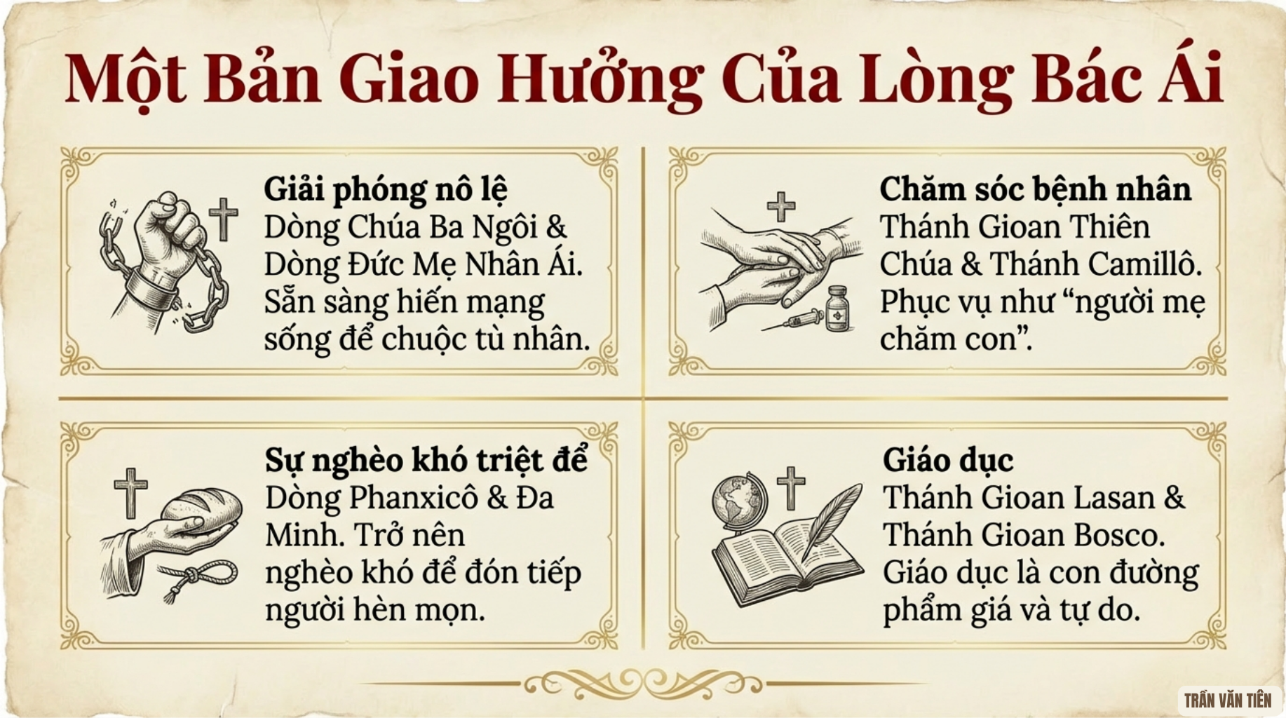 61. Linh đạo nguyên thủy của các dòng tu này bám rễ thâm sâu trong việc chiêm ngắm Thập giá. Chúa Kitô chính là Đấng Cứu Chuộc tuyệt hảo của các tù nhân, và Giáo hội, Thân Mình Chúa Kitô, kéo dài mầu nhiệm này trong thời gian.[48] Các tu sĩ không nhìn việc chuộc tù nhân như một hành động thuần chính trị hay kinh tế, nhưng như một hành vi gần như phụng vụ, một sự tự hiến mang tính bí tích. Nhiều người đã hiến chính thân xác mình để thay cho tù nhân, thực hiện sát nghĩa lệnh truyền: “Không có tình thương nào cao cả hơn tình thương của người đã hy sinh tính mạng vì bạn hữu của mình” (Ga 15,13). Truyền thống của các Dòng này vẫn chưa kết thúc. Ngược lại, nó đã truyền cảm hứng cho những hình thức hành động mới trước tệ nạn nô lệ hiện đại: như nạn buôn người, lao động cưỡng bức, bóc lột tình dục, các hình thức phụ thuộc khác nhau.[49] Bác ái Kitô giáo, khi được thể hiện, sẽ trở thành khai phóng khi được hiện thân giữa đời. Cũng vậy, sứ mạng của Giáo hội, khi trung tín với Chúa của mình, luôn là công bố sự giải phóng. Ngay hôm nay, khi “hàng triệu người, trẻ em, phụ nữ và đàn ông ở mọi lứa tuổi, bị tước mất tự do và buộc phải sống trong những điều kiện giống như cảnh nô lệ”[[50]], di sản ấy đang được tiếp nối bởi các dòng này và bởi nhiều cơ quan cũng như hội dòng khác đang phục vụ nơi ngoại ô thành thị, vùng xung đột và những lộ trình di cư. Khi Giáo hội cúi mình để bẻ gãy những xiềng xích mới đang trói buộc người nghèo, Giáo hội trở nên dấu chỉ Vượt Qua.
