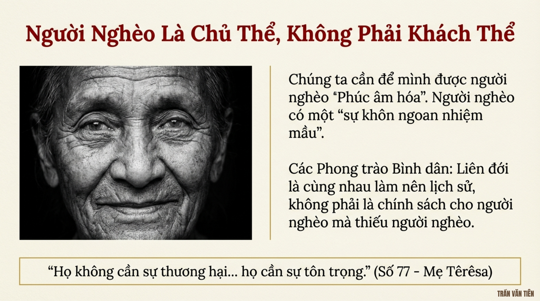 14. Người nghèo không phải do tình cờ hay do một định mệnh mù quáng và tàn nhẫn. Đối với phần đông trong họ, cái nghèo cũng không phải do họ lựa chọn. Thế mà vẫn có người dám quả quyết như thế, bộc lộ sự mù lòa và tàn nhẫn của chính họ. Quả thật, cũng có những người nghèo do không muốn làm việc, có lẽ vì tổ tiên của họ là những người đã làm việc cả đời và đã chết trong nghèo túng. Tuy nhiên, vẫn còn rất nhiều người khác – cả nam lẫn nữ – làm việc từ sáng đến tối, có lẽ chỉ nhặt nhạnh phế liệu hoặc làm những việc tương tự, mặc dù họ biết rằng công việc khó khăn của họ chỉ giúp họ sống qua ngày, chứ khó thể cải thiện đời sống. Cũng không thể nói rằng hầu hết người nghèo là do họ không “xứng đáng” được hưởng những điều khác, như một quan niệm công trạng sai lạc chỉ nhìn thấy kẻ thành công mới là “xứng đáng”.